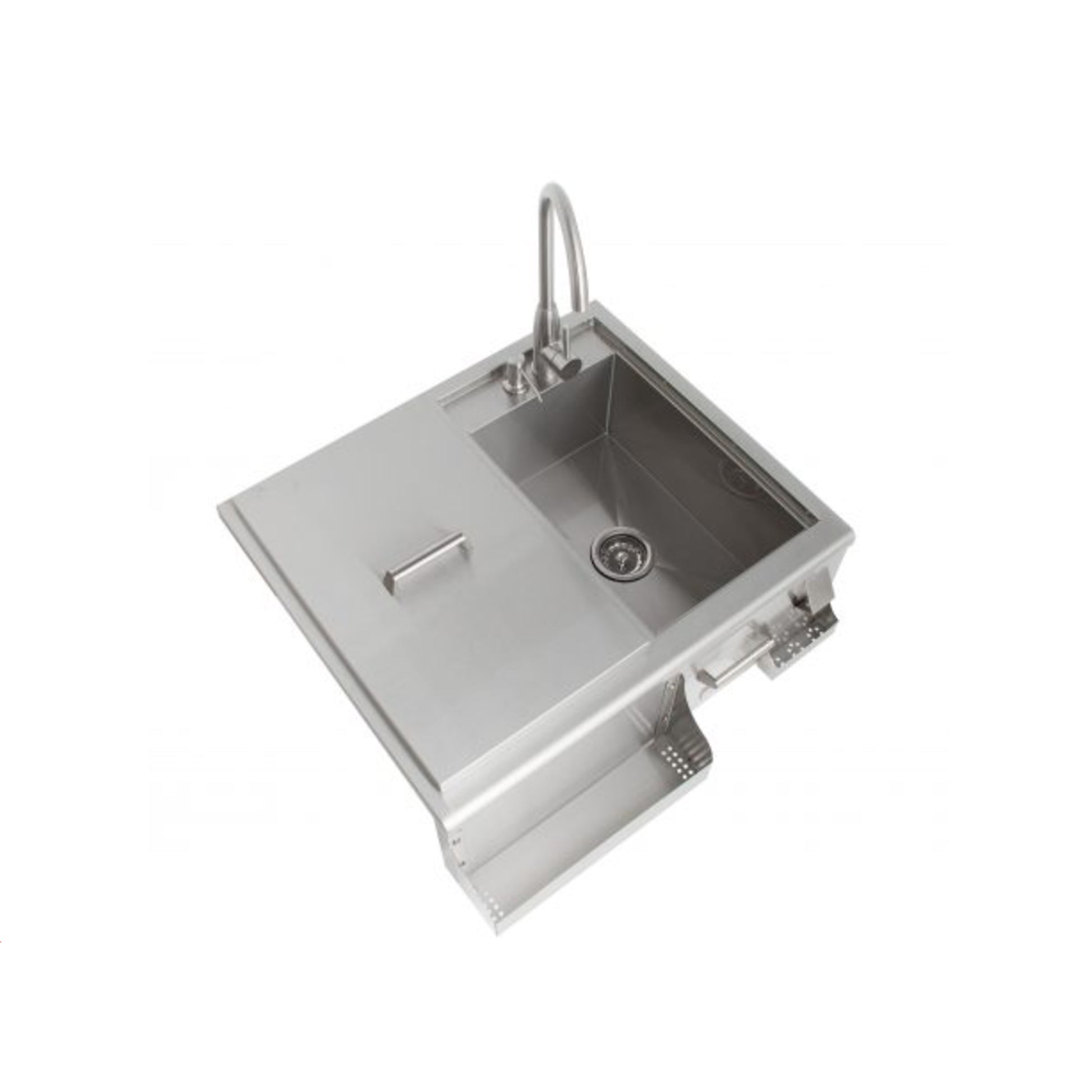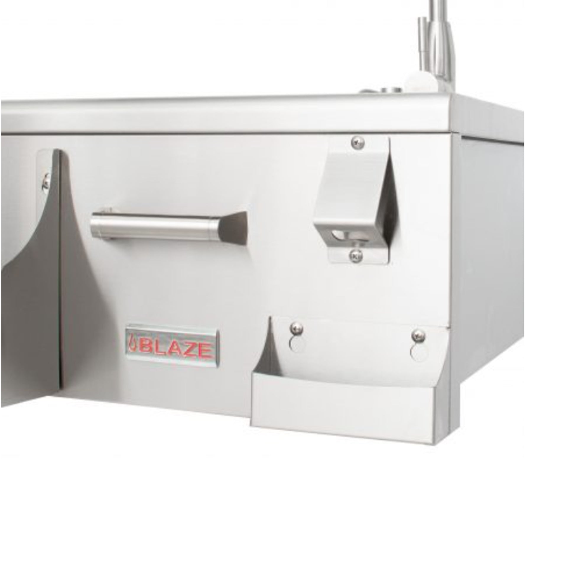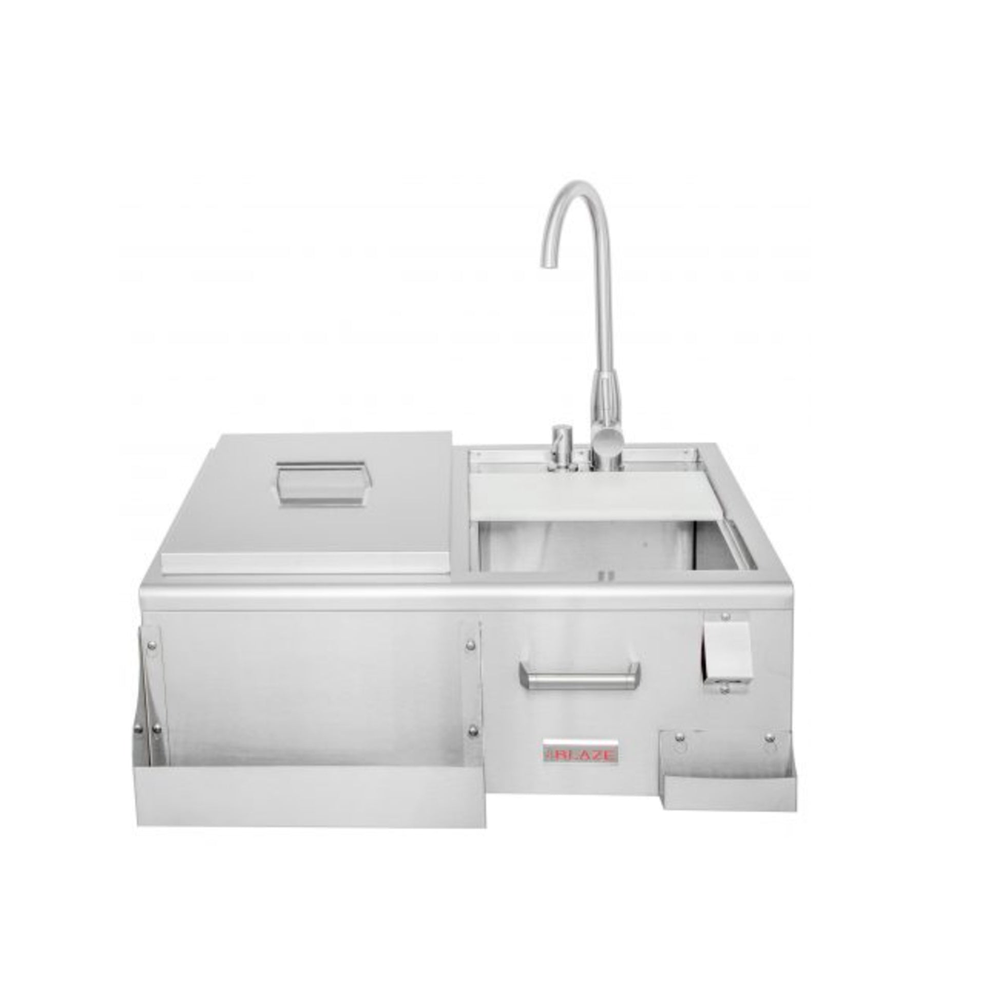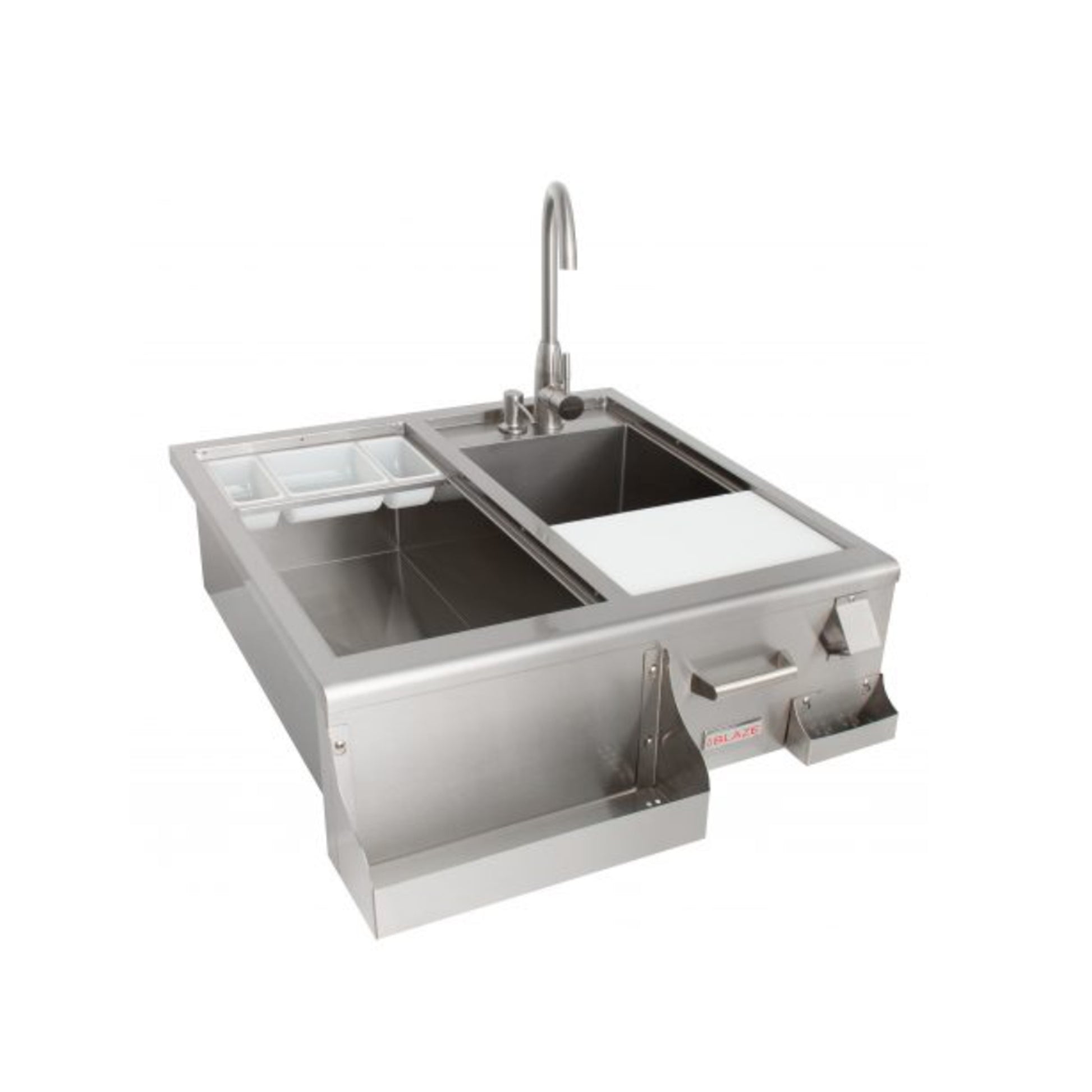 The Blaze Beverage Center was designed with both style and usability in mind. For quick and easy access, there is an attached bottle opener, a built-in soap dispenser, a front bottle storage and a removable three-part condiment tray. Plus, Blaze includes a cutting board that slides across the sink and can be removed for extra space. Made from 304 stainless steel, this beverage center is both durable and stylish with a sleek design and curved edges. This beverage center fits perfectly in any outdoor kitchen.